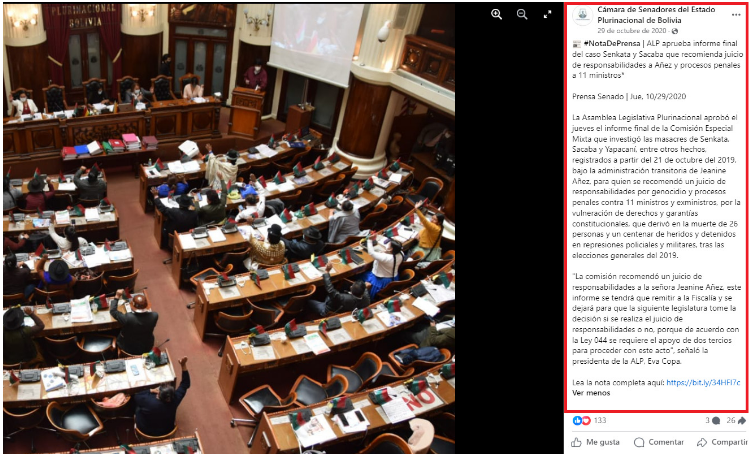 Una nota de prensa difundida por la página oficial del Senado en esa fecha, informa que efectivamente, la Asamblea aprobó el informe final de la Comisión que investigó las masacres de Senkata, Sacaba y Yapacaní, entre otros hechos, registrados a partir del 21 de octubre del 2019, bajo la administración transitoria de Jeanine Añez, “para quien se recomendó un juicio de responsabilidades por genocidio y procesos penales contra 11 ministros y exministros, por la vulneración de derechos y garantías constitucionales, que derivó en la muerte de 26 personas y un centenar de heridos y detenidos en represiones policiales y militares, tras las elecciones generales del 2019”, dice parte de la nota oficial.