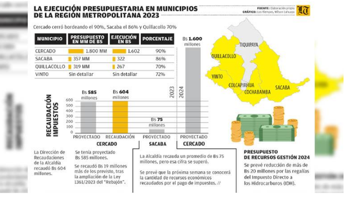 En el caso de Cercado, la ejecución presupuestaria institucional llegó a bordear el 90 por ciento; mientras que Sacaba alcanzó el 86 por ciento, y Quillacollo, el 70 por ciento, de acuerdo a información oficial. (Ver infografía).