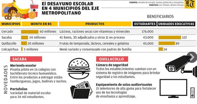En tanto, Sacaba tiene previsto la entrega de 41 ítems del desayuno todo el año por 24 millones de bolivianos y por segundo año consecutivo proyecta dar la merienda escolar en 16 colegios con bachillerato técnico humanístico.