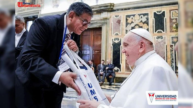 En la ocación el rector de la UMSS le entregó un presente en representación de la universidad pública en un acto protocolar con el papa Francisco.