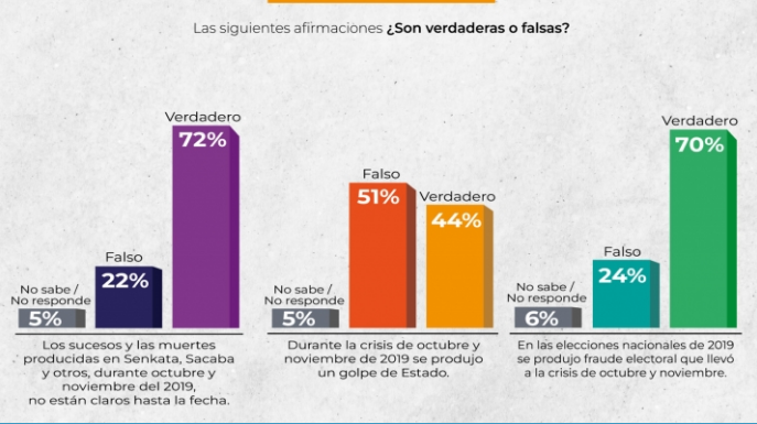 El estudio también refleja que el 72% de los consultados cree que los sucesos y las muertes producidas en Senkata, Sacaba y otros puntos del país, durante octubre y noviembre de 2019, “no están claros hasta la fecha”.