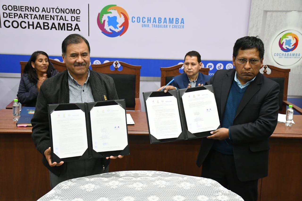 El gobernador Humberto Sánchez suscribió un convenio intergubernativo con el Director Nacional Ejecutivo del Servicio Geológico Minero (SERGEOMIN) René Quelali, para realizar actividades de prospección y exploración minera en Mizque, tareas que permitirán, entre otros aspectos, generar mayores ingresos por regalía minera.