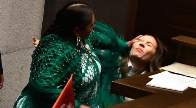 Una de las que obstaculizaba el ingreso a la testera era la diputada arcista Callizaya quien tuvo un forcejeo con su colega de CC Mayra Zalles. En el video subido por Lima se observa que Zalles golpea la cabeza de la arcista y en reacción Callizaya la empuja y hace caer de la grada.