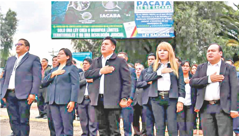 La mañana de este lunes, las autoridades de Sacaba, a la cabeza del alcalde Pedro Gutiérrez, izaron la bandera en la avenida Villazón, en parte de la zona en conflicto, donde además resalta un letrero en el que dice que “Pacata es de Sacaba”; hay otros textos y un mapa.