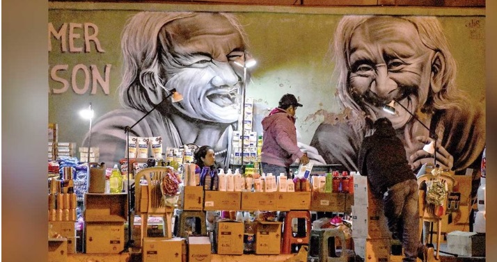 Al margen de la informalidad de quienes se asientan de forma irregular en las aceras de esta avenida, la iluminación artificial que instalan en las noches da pie a también iluminar los rostros pintados en las paredes.