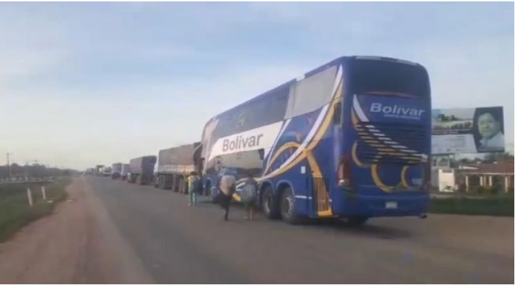 Vuelven los bloqueos en el país. Transportistas que exigen mantenimiento de vías y nivelación del peaje cortaron la carretera que conecta a Santa Cruz con la Chiquitania, Beni y Brasil y generan largas filas de vehículos varados.