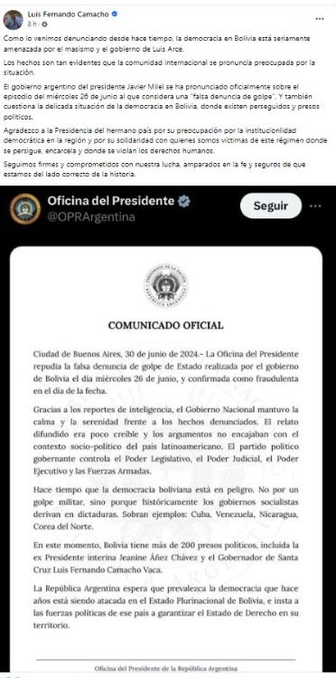 CAMACHO AGRADECE A MILEI POR SU PRONUNCIAMIENTO CONTRA LA «FALSA DENUNCIA DE GOLPE»