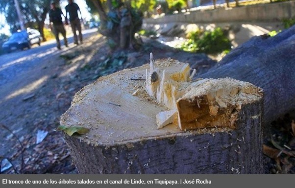 Consternados, entre gritos, agresiones y lágrimas de impotencia, los vecinos de la OTB Linde Sur lograron, ayer, paralizar la tala de árboles en un canal de Tiquipaya. Sin embargo, más de 60 ejemplares fueron tumbados y podados sin autorización, por regantes. La Alcaldía anunció medidas contra los autores y los vecinos iniciarán una acción popular […]