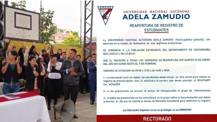 Pese a ser ilegal, no estar reconocida por el Sistema Universitario y arrastrar un proceso por “estafa”, la cuestionada Universidad Nacional Autónoma Adela Zamudio (UNAAZ) volvió a abrir el registro de inscripciones para estudiantes. A través de un comunicado difundido hoy martes, la ‘U’ ilegal, autodenominada “fiscal, pública y gratuita”, anuncio continuar con las inscripciones […]