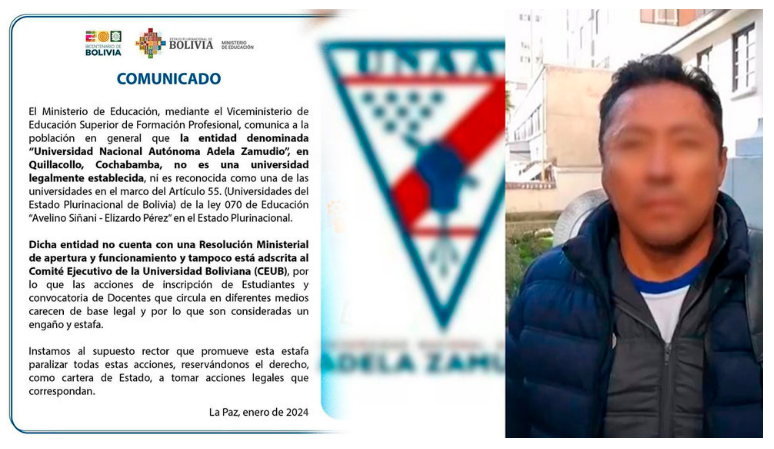 El rector de la Universidad Mayor de San Simón (UMSS), Julio Medina, formalizó hoy viernes, una denuncia ante el Ministerio Público contra B.P., el hombre identificado como “rector” y “fundador” de la Universidad Nacional Autónoma Adela Zamudio (UNAAZ), por el delito de estafa y uso indebido de logo institucional.